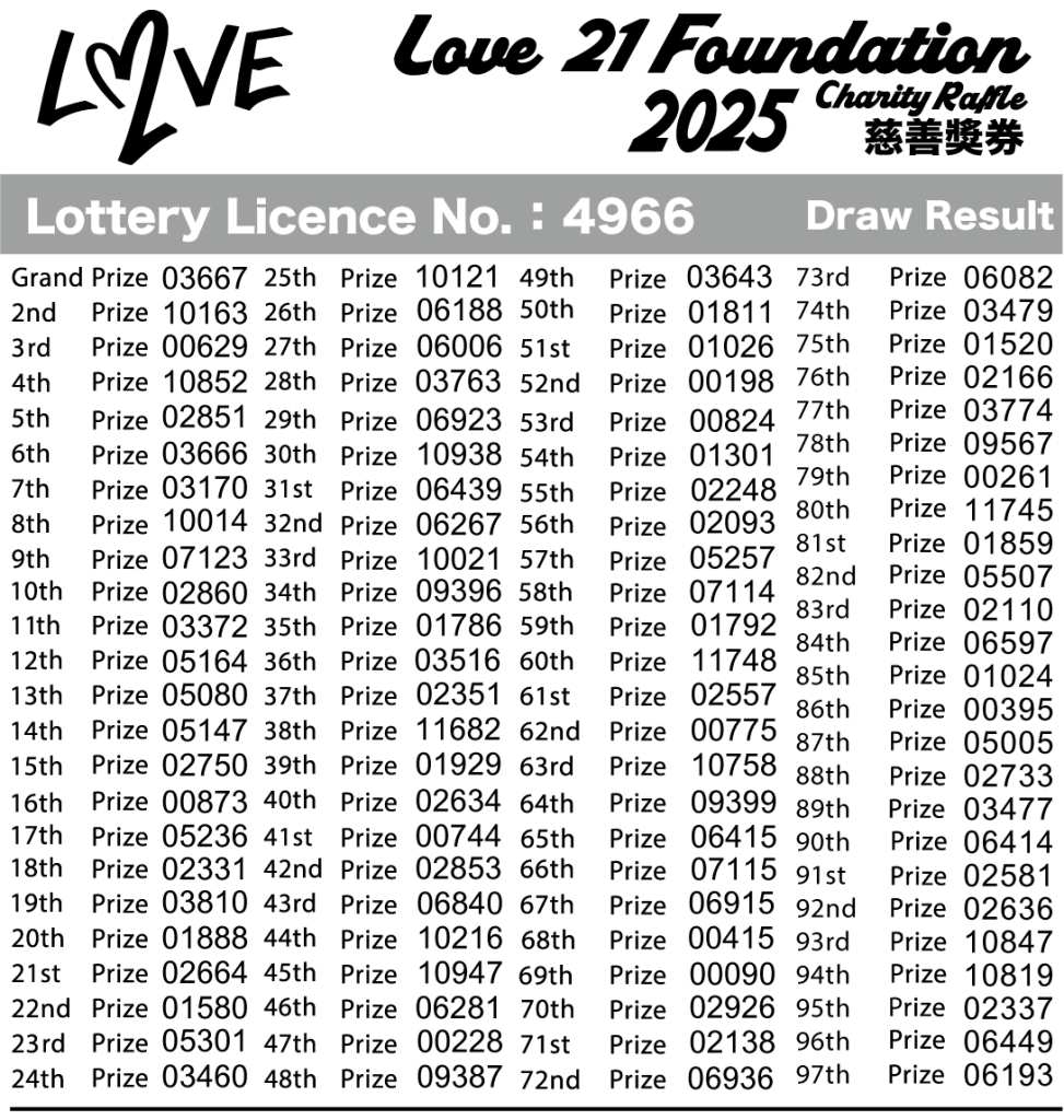 Winners must first register via the form below then personally present the original winning ticket stub at the Love 21 Foundation office (11/F, Trium Lab, 21 Luk Hop Street, San Po Kong) during office hours to claim their prize. All prizes must be claimed on or before March 5, 2026. Unclaimed prizes will be considered forfeited and donated to charity by the Love 21 Foundation without further notice.