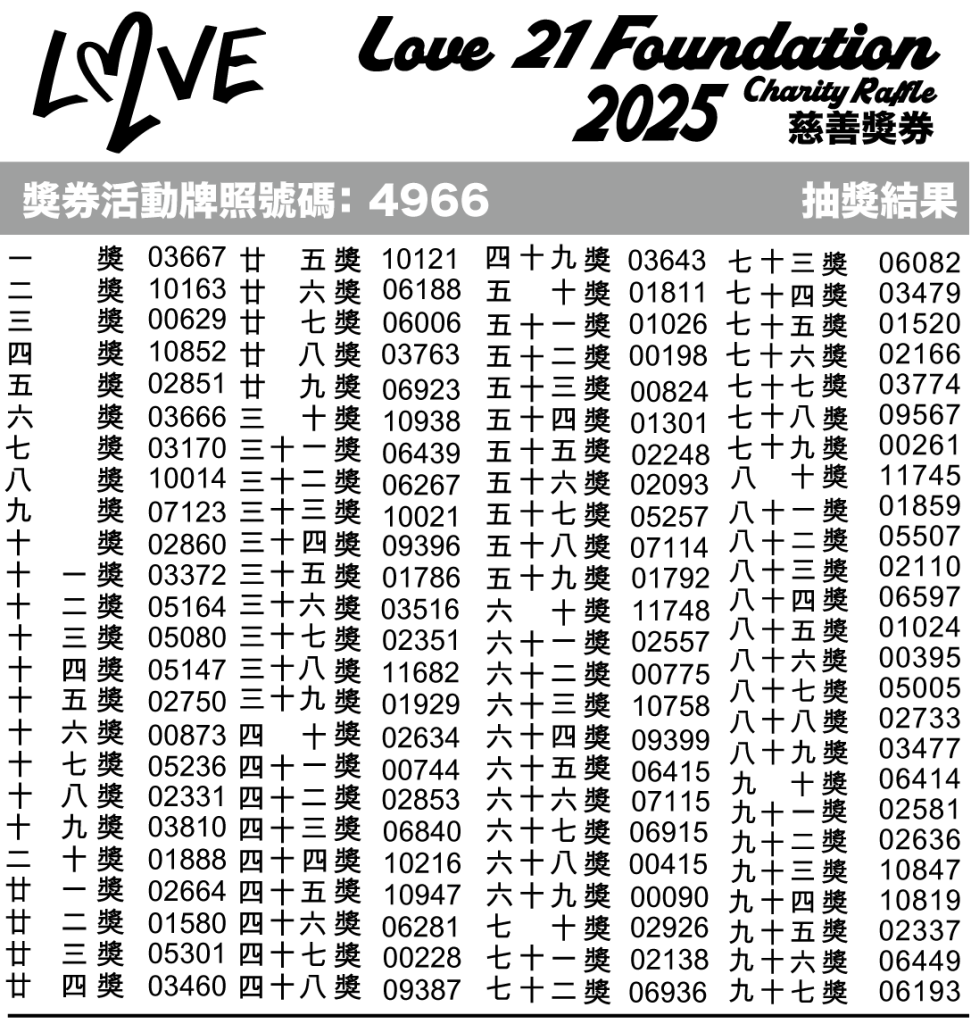 中獎者 必須先透過下面表格登記,並親身擕同中獎獎券正本票根,於辦公時間內前往 Love 21 Foundation 辦事處 (新蒲崗六合街21號Trium Lab 11樓) 領獎。所有獎品必須於2026年3月5日或之前領取。逾期未領的獎品將被視為自動放棄,並將由Love 21 Foundation撥作慈善用途,恕不另行通知。